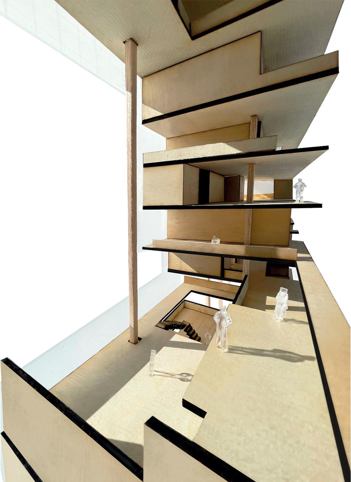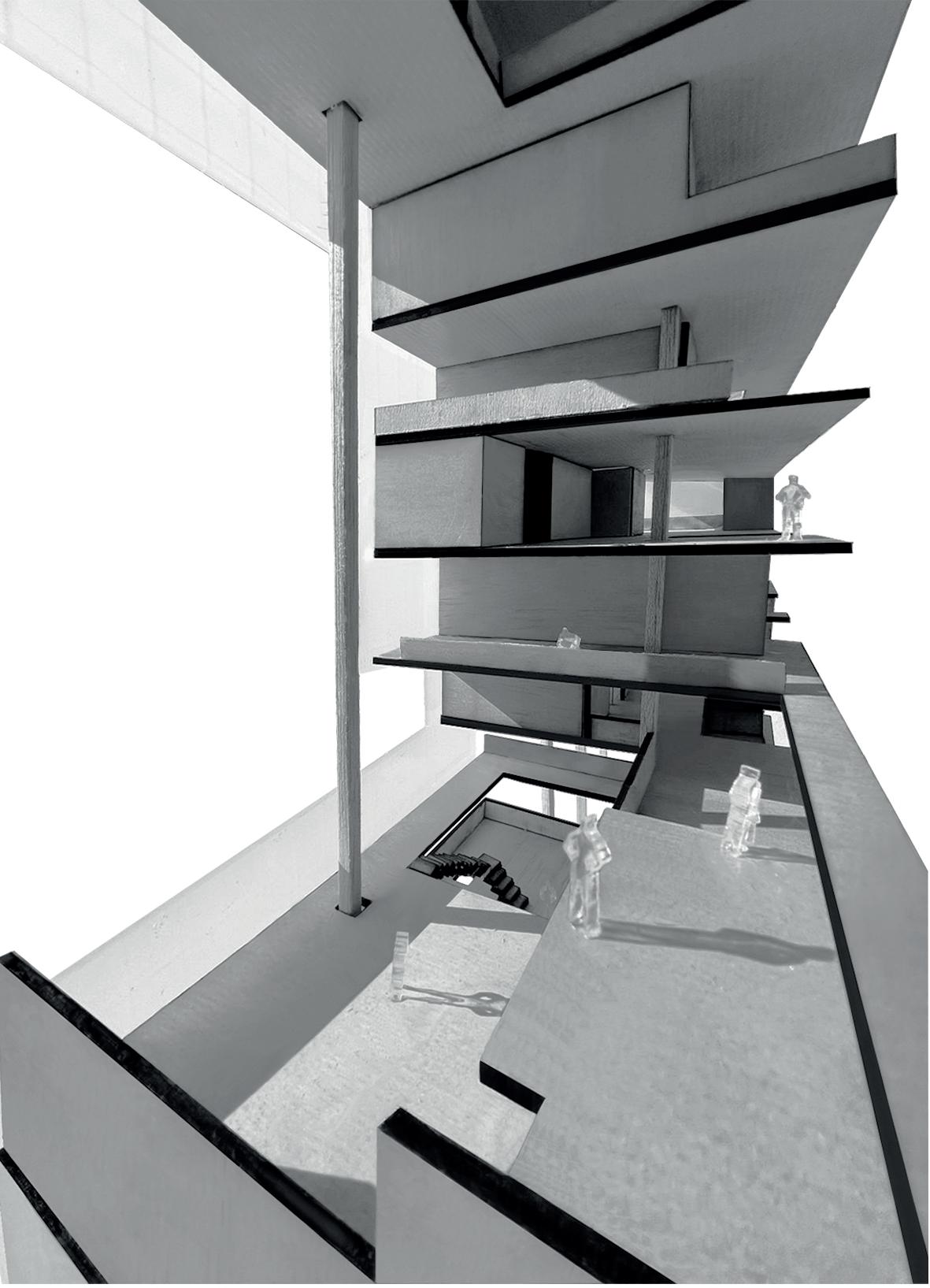 La intención fue crear un edificio que se centre en las relaciones y convivencias entre los vecinos, en la cual haya distintas actividades y que haya distintos tipos de vivienda que se adecuen a la situación en la que se encuentra el usuario. Para lograr esto, basamos el diseño en espacios compartidos enfocándonos en la relación vertical entre plantas y el uso de terrazas comunicadas entre ellas, con la intención de crear oportunidades para que los usuarios interactúen entre sí.