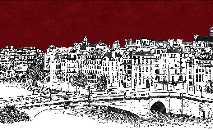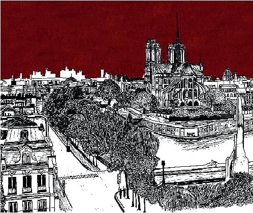 Dibujo Panorámico de Paris, hecho desde el Pont Royal donde se puede observar de la catedral de Notre Dame, Sainte Chapelle en el centro del dibujo y al costado derecho la casa de la moneda de Paris.