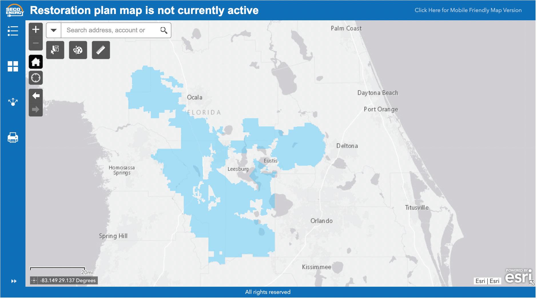 If you want to see if the map has been activated at any time, visit www.SECOEnergy.com and hover over "Contact Us" in the top right corner. Select "Daily Restoration Plan." If activated, you can input your service address and determine if your area is included in the present-day restoration plan. Substations are labeled as a reference, and feeders are outlined in polygons.