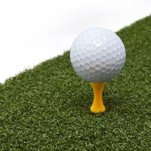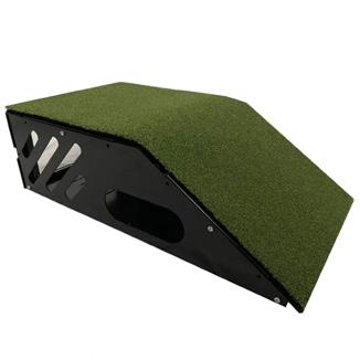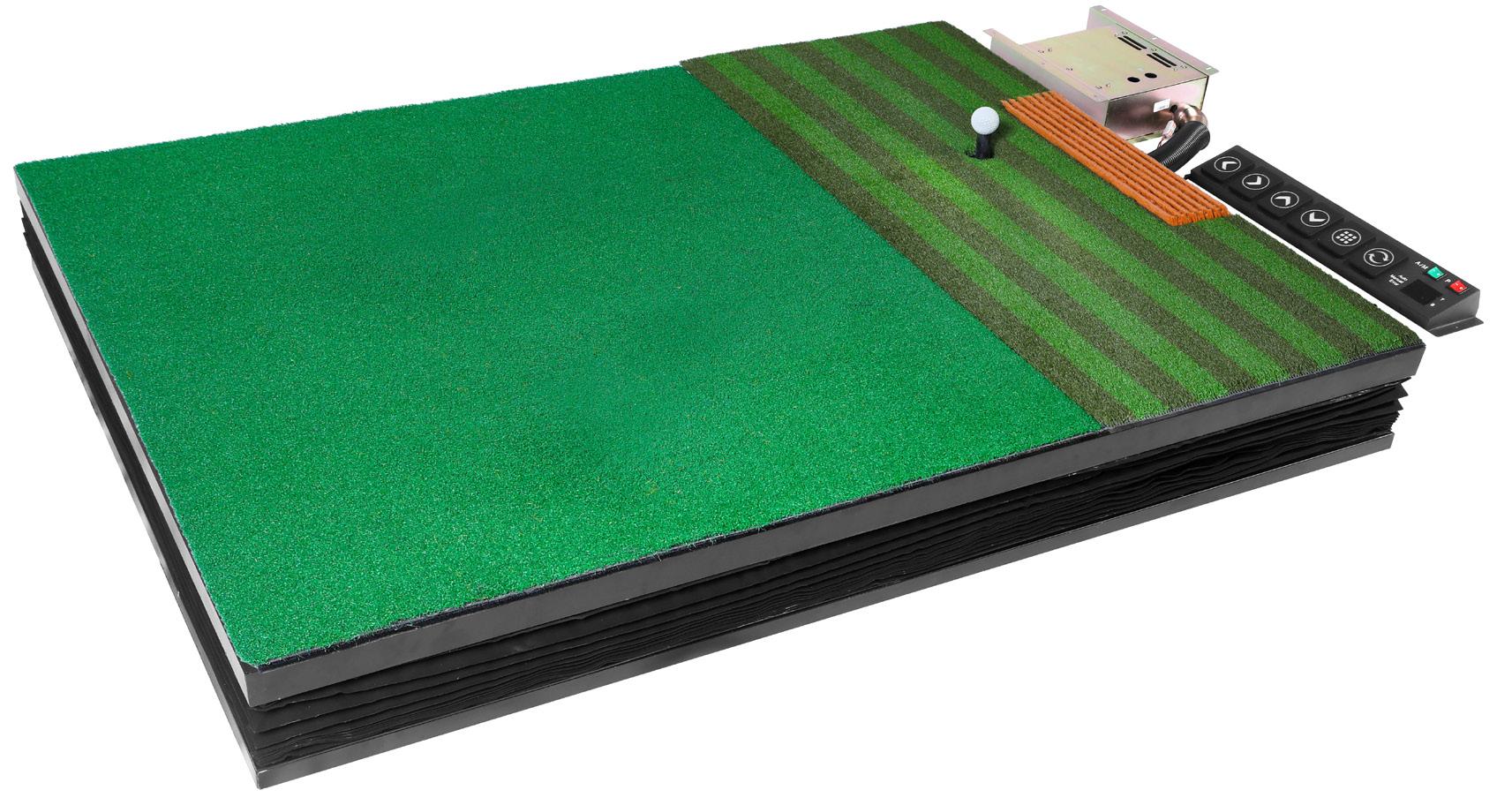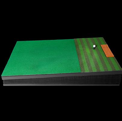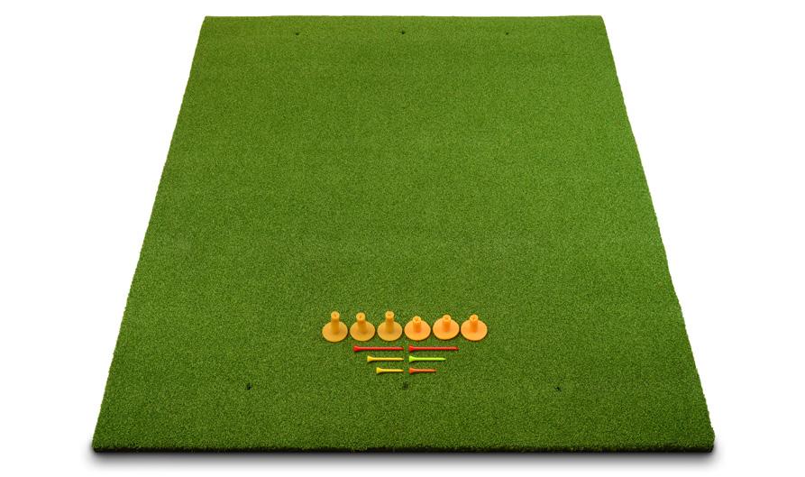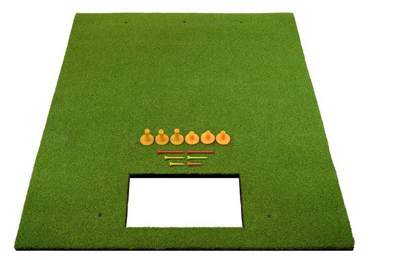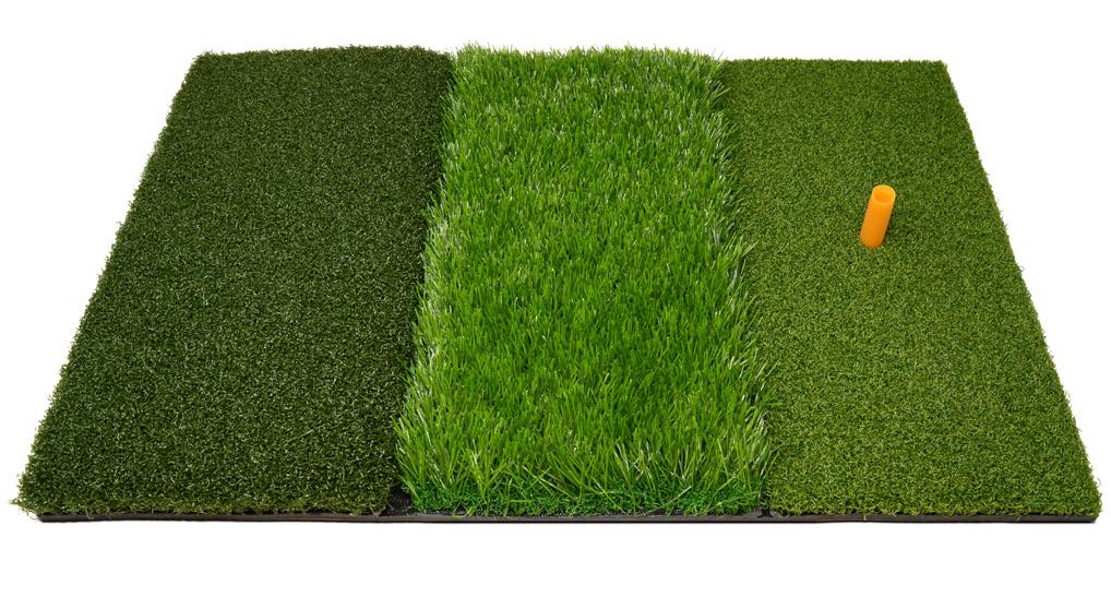 Tri-surface practice mat with integrated rubber tee hole. Designed to replicate real course conditions from rough to fairway with a built-in tee option.
