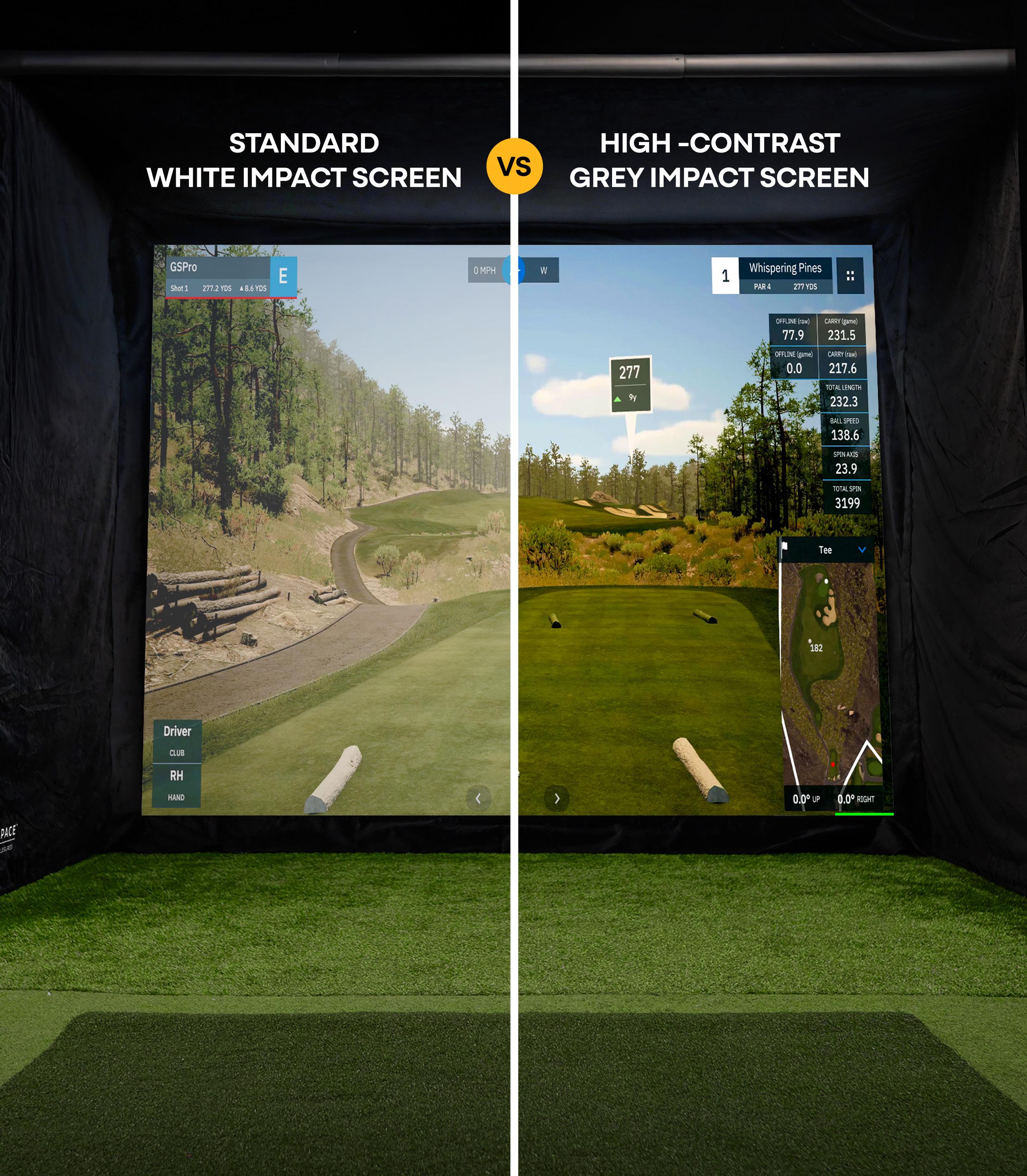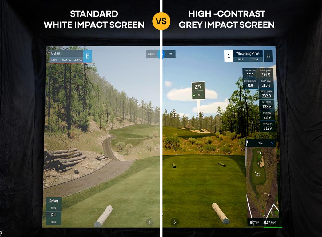 Looking to elevate your visuals even further? Upgrade your sim with the UltraMAX high-contrast grey impact screen. Our grey screen offers all the advantages of the white version while delivering enhanced contrast for richer image depth and superior clarity. Specially engineered to dramatically improve picture quality in indoor golf environments.