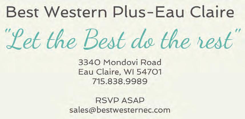 8 | www.receptiontofollow.com Your Wedding. Your Way Our facility is spread out on sixty-nine acres of land overlooking the beautiful Chippewa River. This view could be the backdrop of your special day. The river, foliage and downtown lights at night make for perfect photos that you will love forever. Enjoy your day the way you want to, not the way it is “supposed” to be. We encourage you to be creative and add your personal touch Two separate halls / full bar / small hall has a stage for your band or DJ 4909 Sportsman Dr - Eau Claire | 715-832-4548 | ecwestgate@gmail.com Weddings at WESTGATE ecwestgate.com Say “Yes” to the dress! Get the beautiful, confident wedding smile you've always wanted with adult braces or Invisalign® clear aligners! Invisalign,® the Invisalign logo, and iTero,® among others, are trademarks and/or service marks of Align Technology, Inc. or one of its subsidiaries or affiliated companies and may be registered n the U.S. and/ or other countries Free orthodontic exam and treatment plan No dental referral necessary $0 down and flexible 0% interest financing 715.835.5182 | KristoOrthodontics.com Schedule your no-cost, personalized consultation with our expert team today!