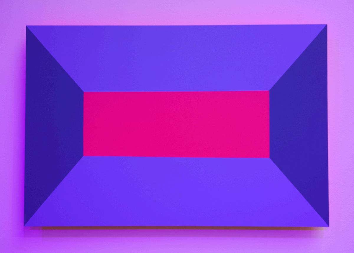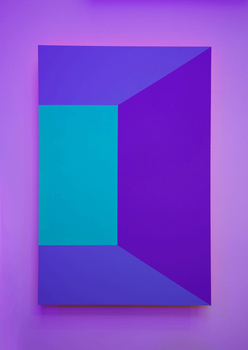 The Open Frame installation of 26 paintings is inspired by architect and designer Le Corbusier’s Ronchamp chapel. The paintings in Luftwerk’s installation utilize one-point perspectives, simplified geometric shapes, and an interplay of fluorescent and acrylic paint in the compositions to evoke the light dispersed through Ronchamp’s stained glass windows