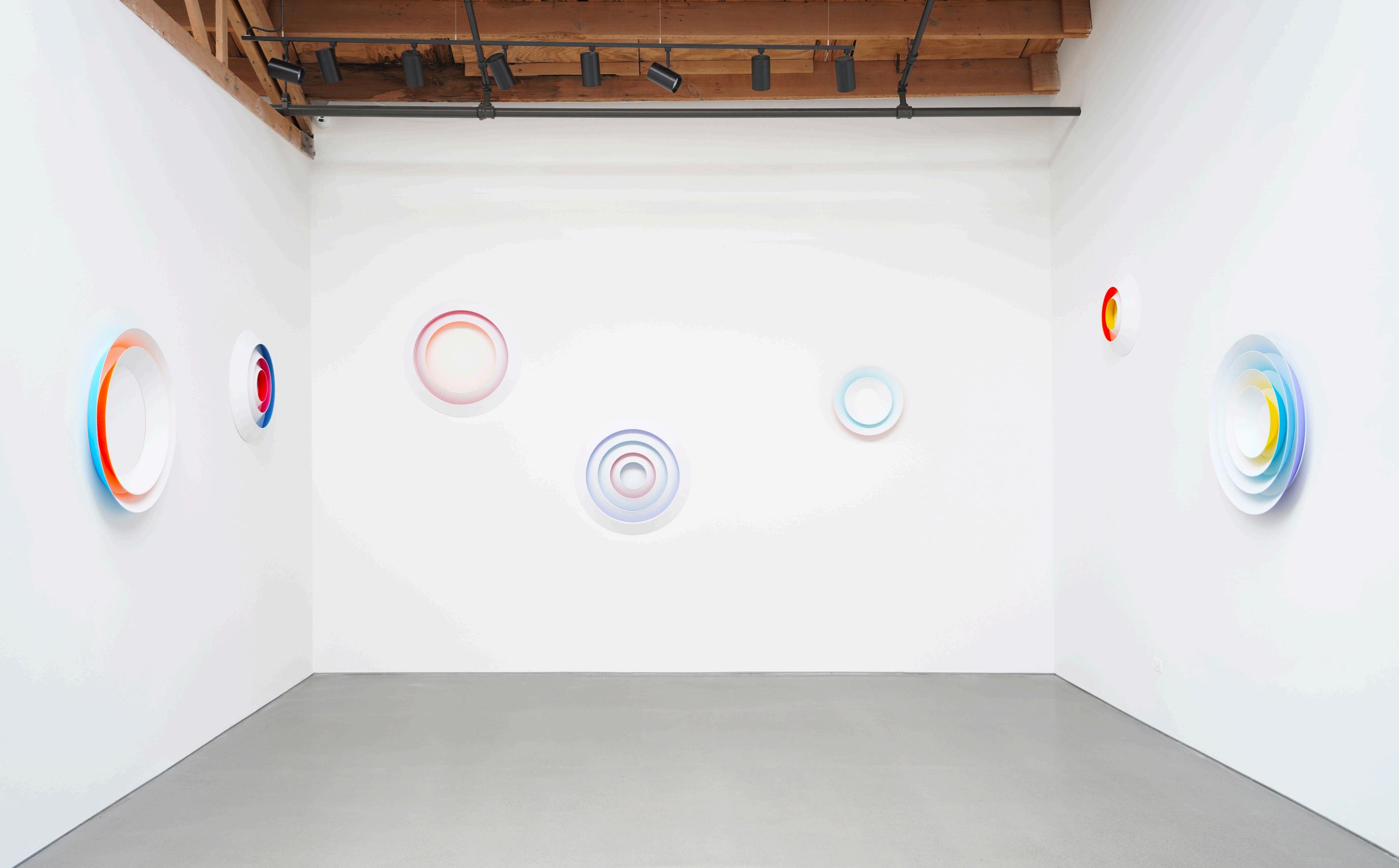 With changing ensembles, Luftwerk’s Aurae draw on the color palettes of dawn and dusk, with saturated colors painted on the underside of concentric spun aluminum rings. Through the reflection and emission of color on the front surfaces of the rings, a subtle glow emanates within the negative space.