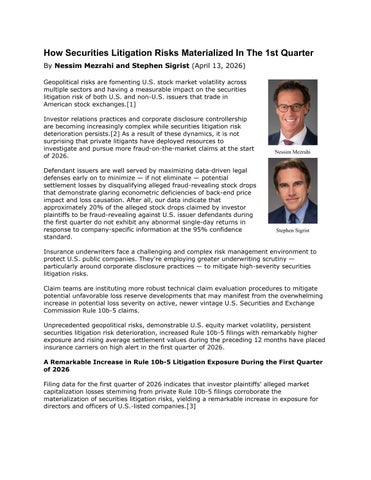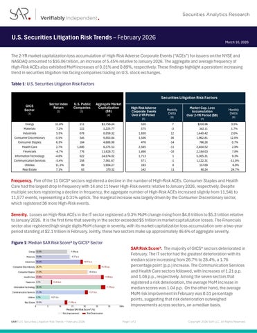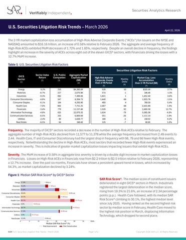 Securities Analytics Research (SAR): SAR LLC is a specialized data analytics company focused on securities litigation risk management analytics of U.S. public companies, founded in 2018 and based in Bethesda, MD. Through the SAR Platform®, users license verifiably independent and high-quality data analytics based on near real-time stock price performance in response to public companies’ corporate disclosures. SAR is the developer and publisher of the SAR Risk Score®, which is assigned to issuers that trade on the NYSE or NASDAQ at the close of trading. SAR applies the court-approved event study methodology to test stock price reaction on the universe of corporate disclosures to accurately estimate the probability and magnitude of securities litigation risk impacting directors and officers. SAR provides verifiably independent securities class action settlement valuations as evidentiary support in mediated negotiations that resolve securities claims that allege violations of the federal securities laws under the Exchange Act of 1934 and Securities Act of 1933. The company is committed to the verifiable independence and accuracy of the licensed data and has been publishing quarterly statistical back-testing results since 2018. SAR does not rely on artificial intelligence (AI) or machine learning (ML) and operates in accordance with documented standard operating procedures with assigned process owners to ensure independent, human accountability. The company does not engage in economic consulting, nor places capital at risk on behalf of investors or insurers. SAR does not actively trade, hold, or intend to hold positions on the universe of equity issuances listed on the NYSE or NASDAQ, and whose principals and full-time professionals are restricted from actively trading.