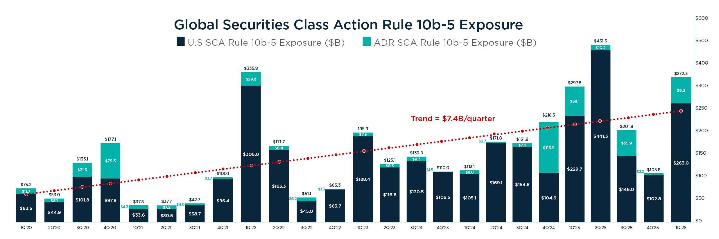 Alleged market capitalization losses that are accounted for only on alleged stock drops claimed against U.S.-listed corporations that exhibit statistically significant residual stock price returns amounted to $272.3 billion in the first quarter of 2026, a 157.6% increase relative to the prior quarter's global exposure of $105.7 billion.[4] The remarkable increase in securities class action exposure, through market capitalization losses, is driven by three main factors.