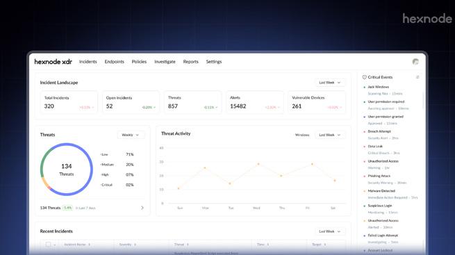Hexnode XDR reimagines the XDR experience with usability at its core. Its clean, structured dashboard unifies endpoints, alerts and vulnerabilities into a single view, simplifying how IT teams assess and respond to threats.