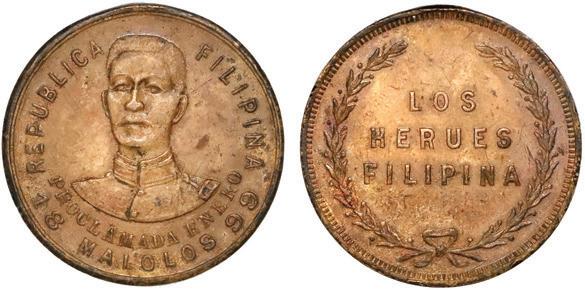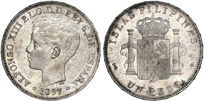 1570. Philippines (under Spain), 10 centavos, Alfonso XII, 1885, NGC MS 66. KM-148. Impressive gem coin with brilliant luster across silvery white surfaces possessing hints of golden toning around the rims. (Note: KM and many catalogers refer to this issue as 10 centimos in error.) NGC #3168233-002. Estimate: $200-$300.