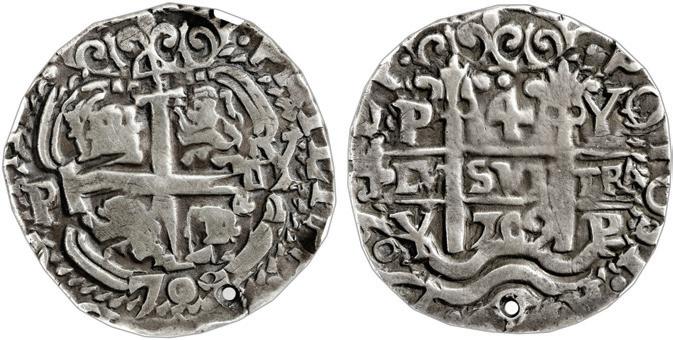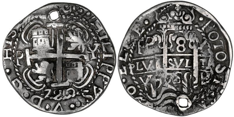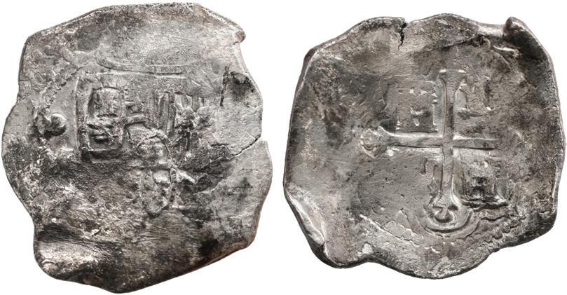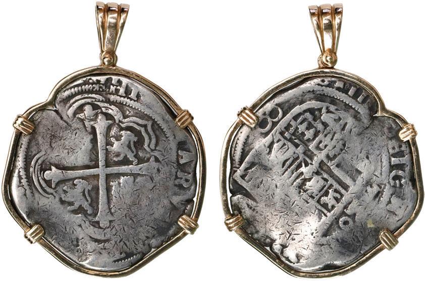 1609. Potosí, Bolivia, cob 8 reales, 1620 T, mounted crossside out in 14K gold pendant with shackle bail. 12.93 grams total. Pitted and corroded but with clear 0 of date followed by x in legend, wrapped in gold wire, four prongs and lightweight bail. Estimate: $150-$225.