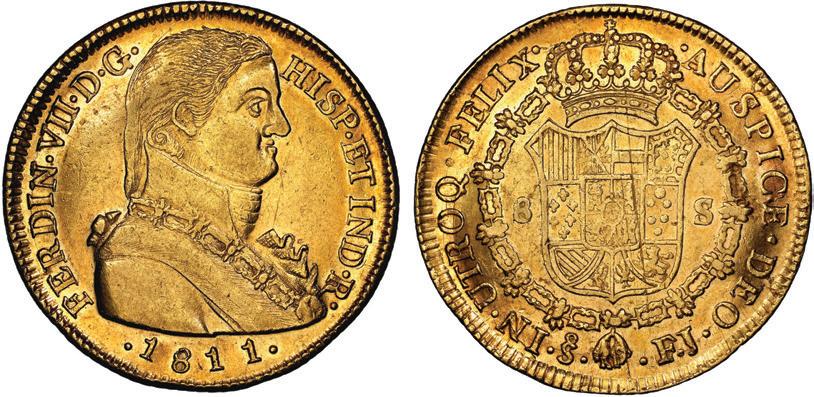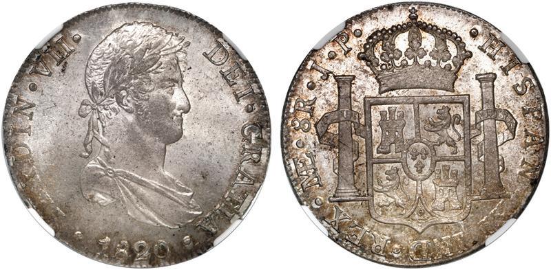 1568. Lima, Peru, bust 8 reales, Ferdinand VII transitional (large “imaginary” bust), 1809 JP, king’s name as FERDIN, NGC AU 58. KM-106.2; Cal-1239. Bright, silver-white surfaces with light rub on the high points to denote the grade, only one finer in MS 62 on the NGC census. NGC #6443033-003. Estimate: $150-$225. 1569. Lima, Peru, bust 8 reales, Ferdinand VII 1813 JP, NGC MS 61. KM-117.1; Cal-1246. Scarce Mint State piece with original mint luster accented by golden toning on the obverse and brilliant silver fields on the reverse, sharp peripheral detail with center design a little flat on high points due to strike weakness. NGC #6324295-001. Estimate: $200-$300.