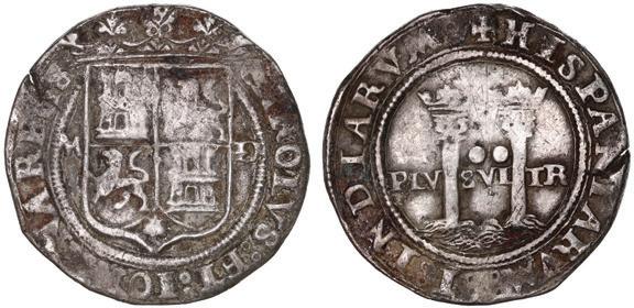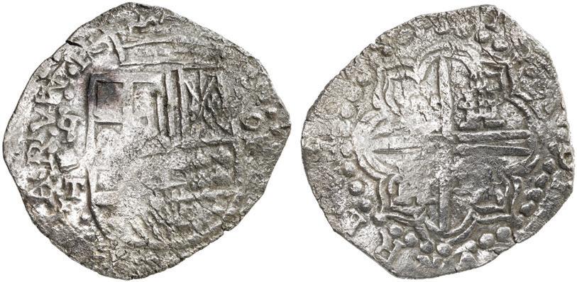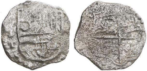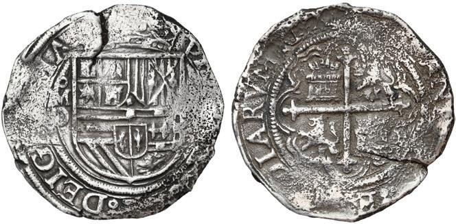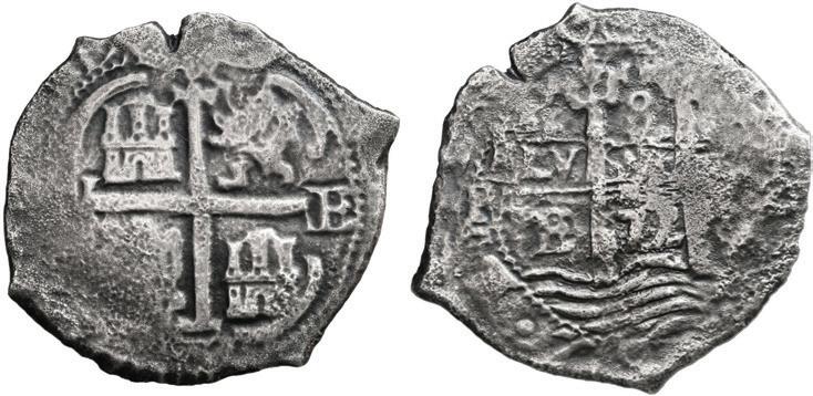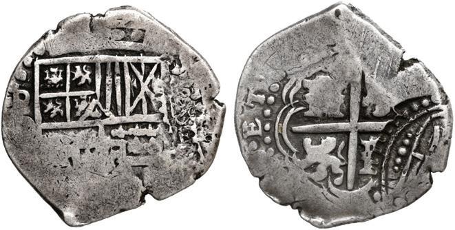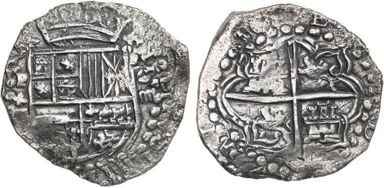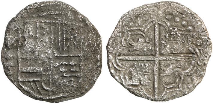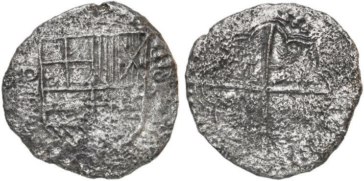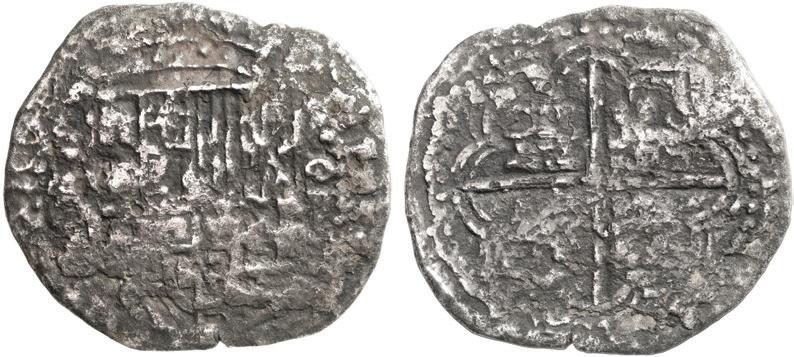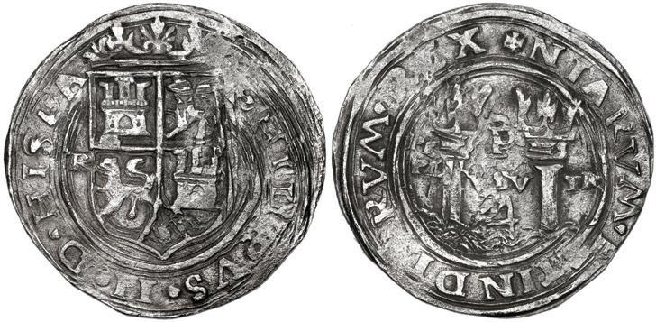 7. Seville, Spain, gold cob 2 escudos, 1597 date to right, assayer B below mintmark S and denomination II to left. Cal-797. 6.60 grams. XF with dark sediment in crevices making for great contrast. Significantly, the Calicó listing says “assayer not visible,” whereas this coin clearly shows a bold full S-II-B in addition to the bold date. Estimate: $1,250-$2,000.