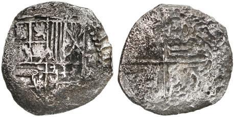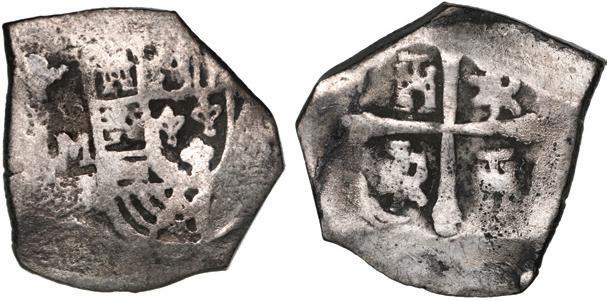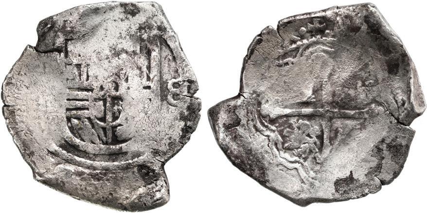 1606. Mexico City, Mexico, cob 1 real, Philip II, assayer O to right, mounted cross-side out in 14K gold pendant with swivel bail and dolphin and seahorse embellishments. 6.06 grams total. Worn, holed coin with two flan cracks (visible only from reverse side), set in an attractive pre-made bezel with dolphins and seahorse. Estimate: $150-$225. 1607. Mexico City, Mexico, cob 1 real, Philip III, assayer F, mounted cross-side out in heavy silver pendant with 14K gold prongs and shackle bail. 8.11 grams total. Good full shield and cross, both nicely toned, probably lightly rounded on edge to fit the nearly round custom bezel of silver with gold prongs and bail. With photo-certificate. Estimate: $125-$200.