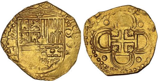 9. Seville, Spain, gold cob 1 escudo, Philip II, assayer Gothic D to right, mintmark S to left, NGC VF 35. Cal-784. 3.19 grams. Bold full cross, most of shield (flat spot near edge), contrasting sediment in crevices. NGC #6476382-011. Estimate: $700-$1,000.