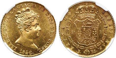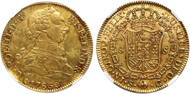 1. Seville, Spain, gold 1 escudo, Charles-Joanna, assayer * to right, mintmark S to left, NGC MS 61. Cal-196. 3.21 grams. Well-detailed full shield and cross, some legend, nicely toned. NGC #6476382-038. Estimate: $1,250-$2,000.