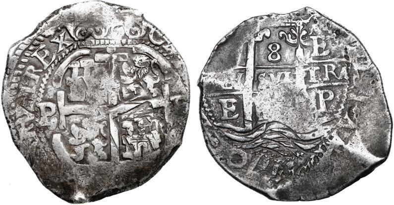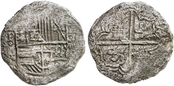 Atocha, sunk in 1622 west of Key West, Florida 1601. Potosí, Bolivia, cob 8 reales, Philip III, assayer R (curved leg), Grade 4, ex-Atocha (1622), mounted in 14K gold-wire pendant with fixed bail. 17.62 grams total. Unusual, lightweight, wrapped-wire bezel and bail with appealing design, compensating for lack of detail in the sand-washed, bright silver coin. From the Atocha (1622), with Fisher and photo-certificate 00A-61940 (tag missing). Estimate: $350-$500.