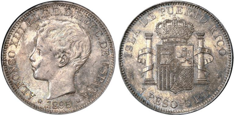 1571. Puerto Rico, 20 centavos, Alfonso XIII, 1895 PG-V, NGC AU 55. KM-22; Cal-126. Very lustrous surfaces with minor fric tion for the grade, well struck with sharp details throughout. NGC #6289287-005. Estimate: $125-$200.