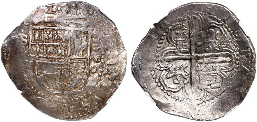 8. Seville, Spain, gold cob 1 escudo, Philip II, assayer Gothic D to right, mintmark S to left, NGC AU 55. Cal-784. 3.40 grams. Good full cross, nearly full (and well-detailed) crown and shield, parts of edge on both sides crude (as made). NGC #6476382-012. Estimate: $800-$1,200.
