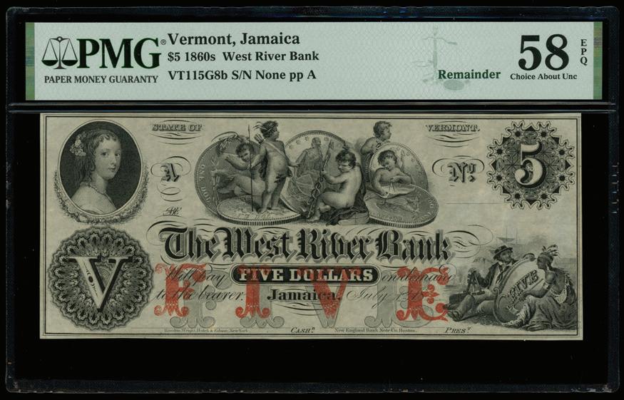 1582. Cuba, Junta Central Republicana de Cuba y Puerto Rico, 1869, serial U 6075, PMG AU 53 net / edge damage, small stains, ex-EMO collection. SCWPM-61. Decent Cuban In dependence note with minor edge damage and toning spots as noted on the label. Pedigreed to the EMO collection (stated on the label). PMG #8009123-043. Estimate: $60-$90.