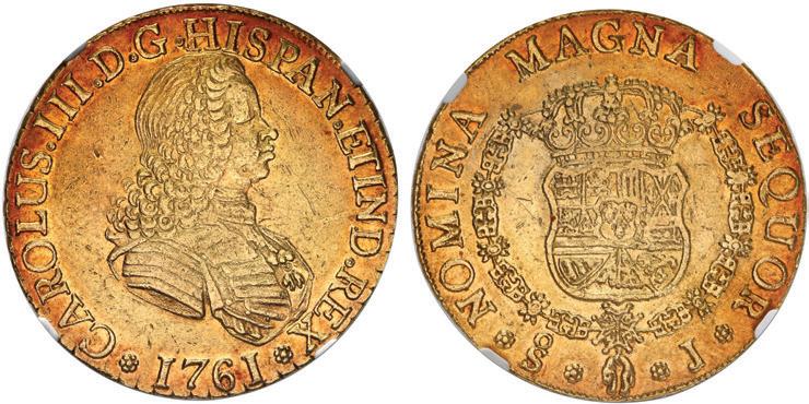 1567. Lima, Peru, gold 8 bust escudos, Charles III, 1780 MI, NGC AU 55. Fr-32; KM-82.1; Cal-1942. Brilliant example with lustrous golden fields and well-defined details (particularly on the reverse), some natural lamination flaws around the bust. NGC #2127605-001. Estimate: $1,750-$2,500.