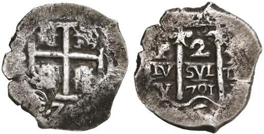 1605. Lima, Peru, cob 2 reales, Philip V or Louis I (date and assayer not visible), ex-Princess Louisa (1743), mounted cross-side out in 14K gold pendant with shackle bail and pirate-face embellishment on both sides. 12.22 grams total. Interior details of coin visible, clear 2 of denomination, set in a thick custom gold bezel, three prongs, bail and pirate-faces on either side, essentially making it wearable either side out (although the cross side is rotated 90 degrees). From the Princess Louisa (1743), with certificate and booklet. Estimate: $200-$300.
