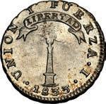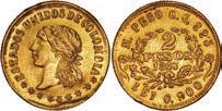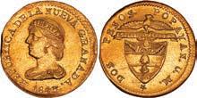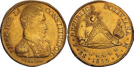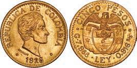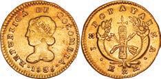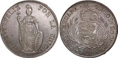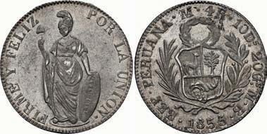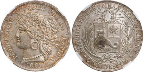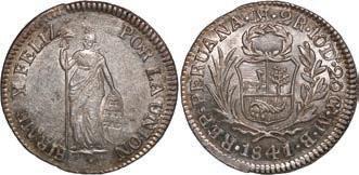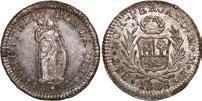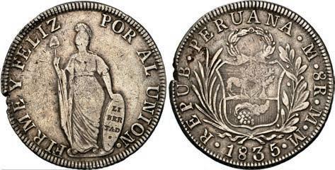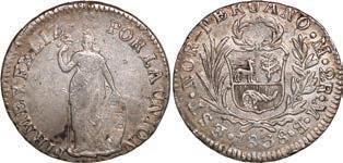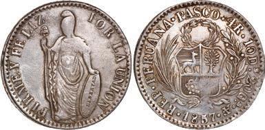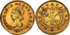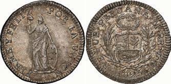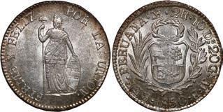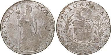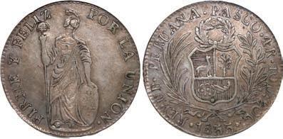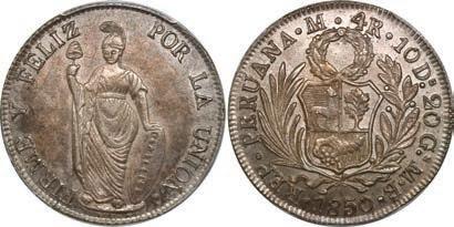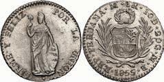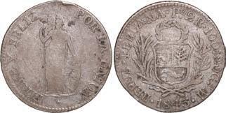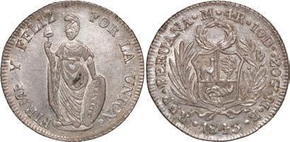 2031. PERU, Lima, 1 real, 1839 MB, ex-O’Brien. KM-145.1. 2.61 grams. Lustrous AU+ with an off-center strike leading to some weakness in part of the legends, very flashy fields with pale golden toning, among the best known examples for the date. Pedigreed to the John O’Brien Collection, with his tag. Estimate: $150-$225. 2032. PERU, Lima, 1 real, 1850 MB, RBP PBRUANA, exO’Brien. KM-145.4. 3.64 grams. Interesting type with B die-punch used for the E in REP and PERUANA. Lustrous and beautifully toned UNC with blue and gold color across brilliant, almost prooflike fields, very well struck with bold design and legends. Pedigreed to the John O’Brien Collection, with his tag. Estimate: $125-$200.
