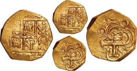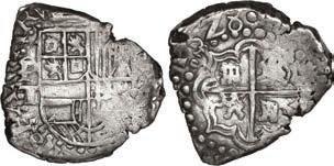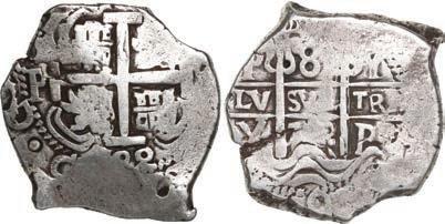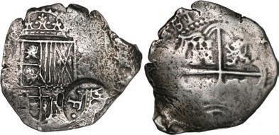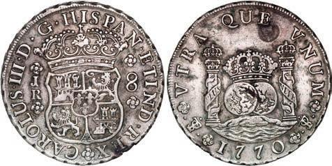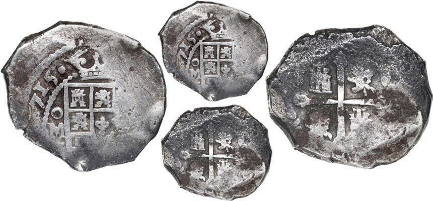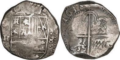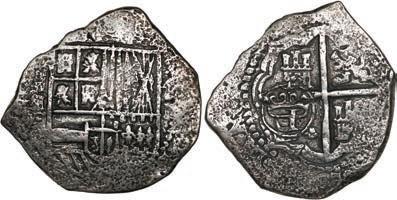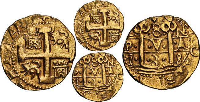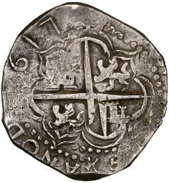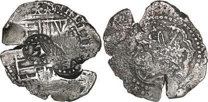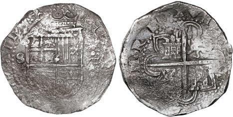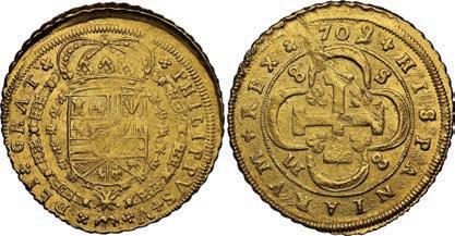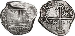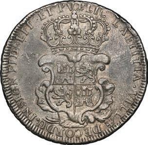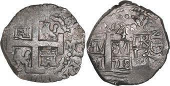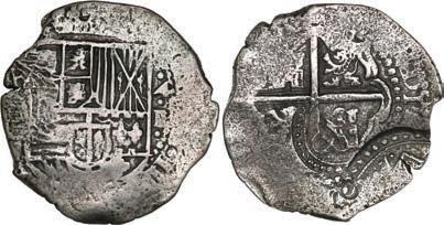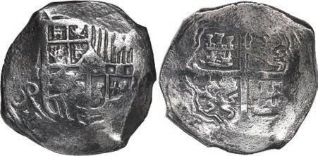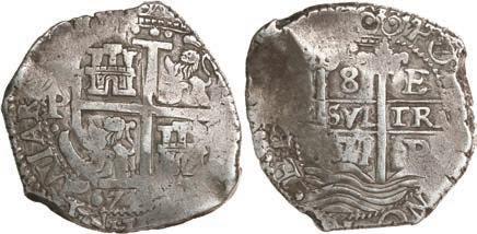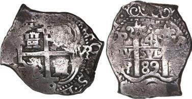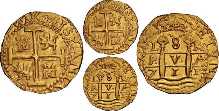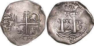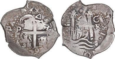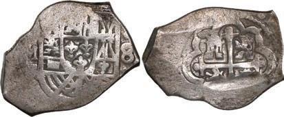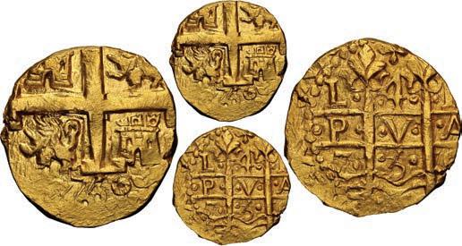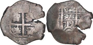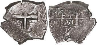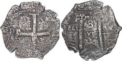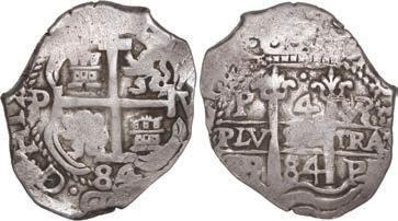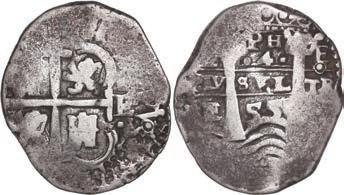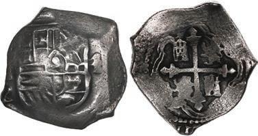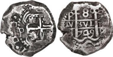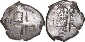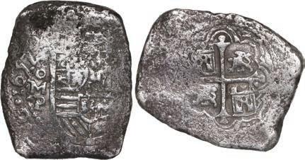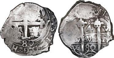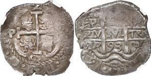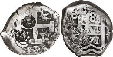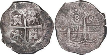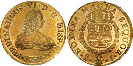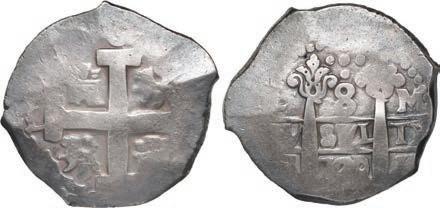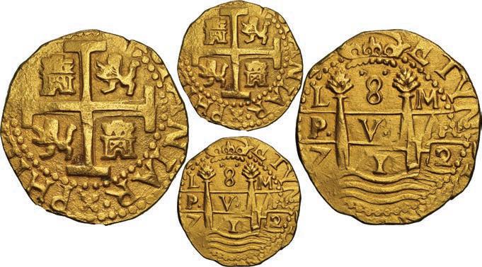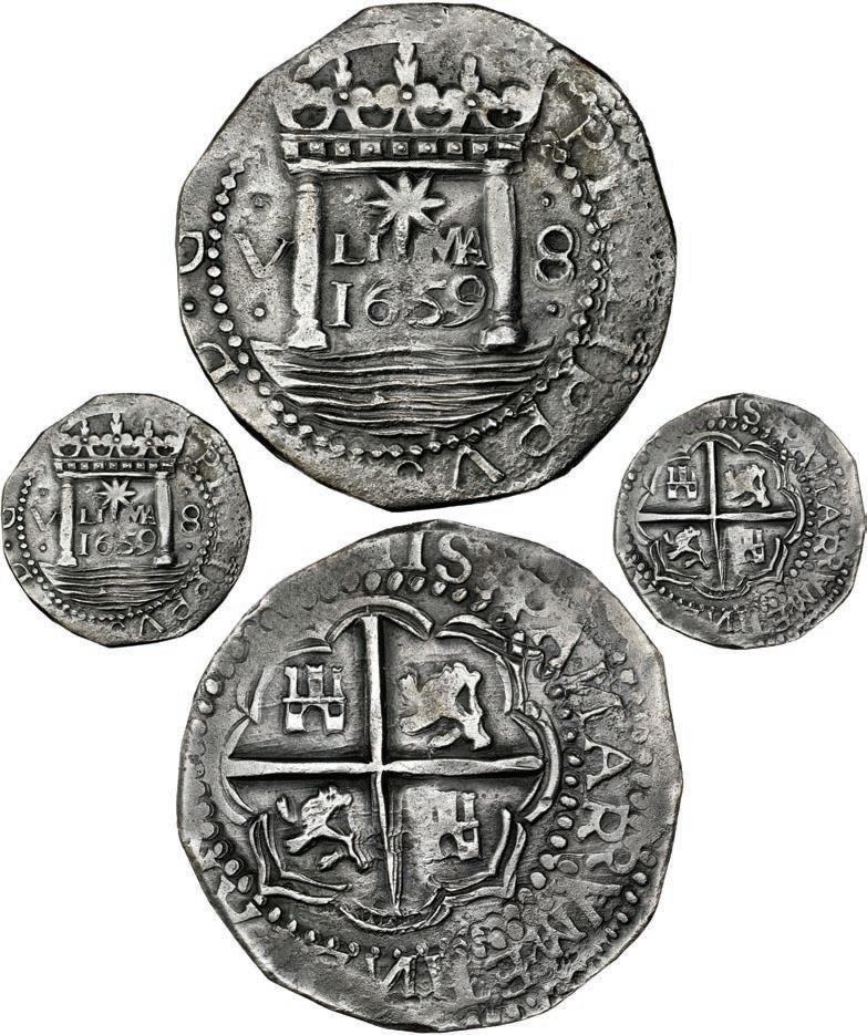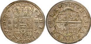 In our Gold Cobs section you will find such trophies as a Seville, Spain, 1681/0/79 S gold cob 8 escudos graded NGC MS 61 (Lot 23) and the finest known Seville, Spain, 1659 (R) gold cob 8 escudos graded NGC MS 63 (Lot 17). Also note a lovely Lima, Peru, 1748 R gold cob 8 escudos graded NGC MS 63 (Lot 37).