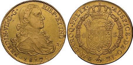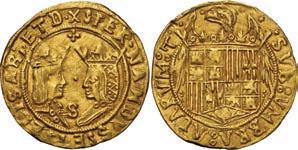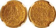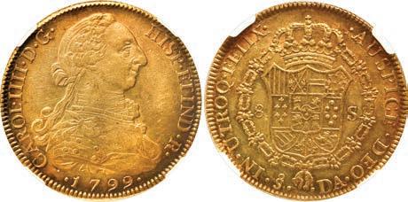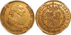 1. SPAIN, Seville, gold 1 escudo, Charles-Joanna, assayer * to right, mintmark S to left, NGC MS 62. Cal-196; Fr-153. 3.37 grams. Complete design all over with full legends and no doubling, also perfectly centered, hint of luster, a choice example to be sure. NGC #6981534-003. Estimate: $2,500-$3,750.