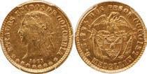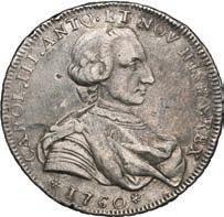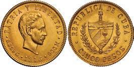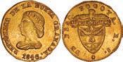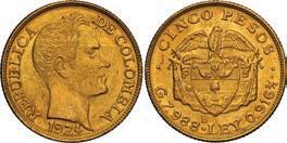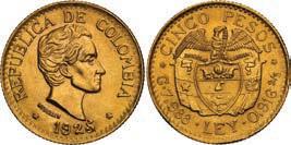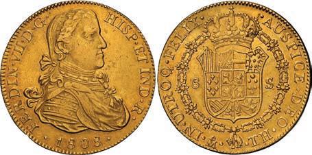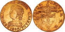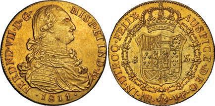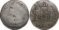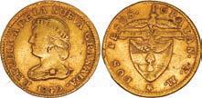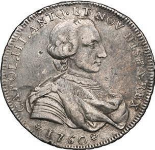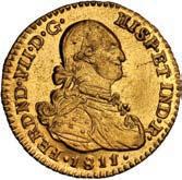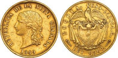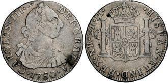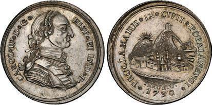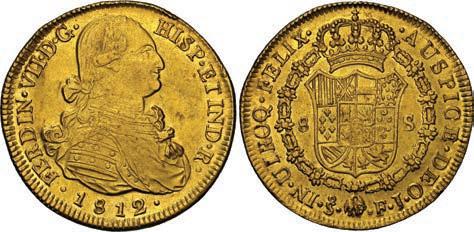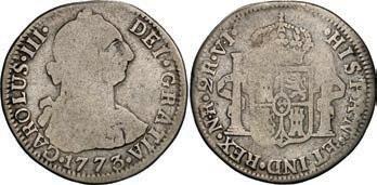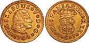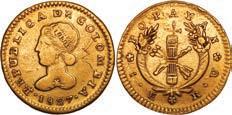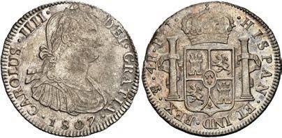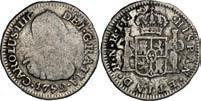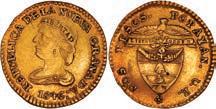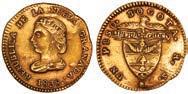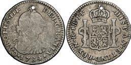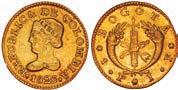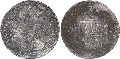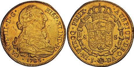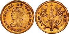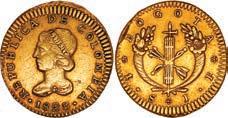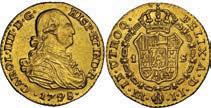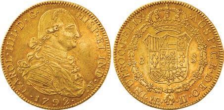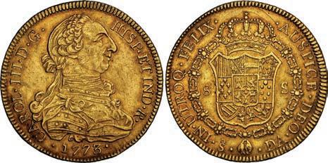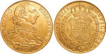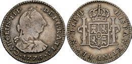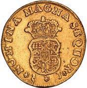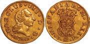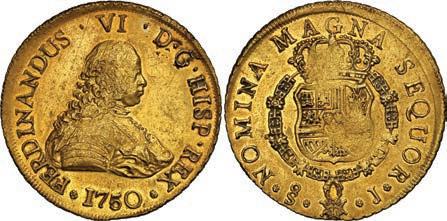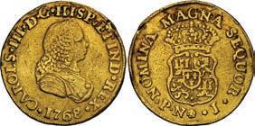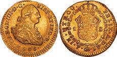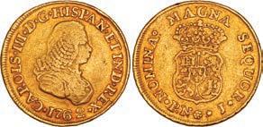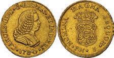 2048. SPAIN, Madrid, gold bust 2 escudos, Charles III, 1776/4 PJ. Cal-1550; KM-unl (417.1 for type); Fr-286. 6.71 grams. VF with some surface marks, light sedimentation on the reverse, popular date with U.S. collectors. Estimate: $700-$1,000. 2049. SPAIN, Madrid, gold bust ½ escudo, Charles III (young bust), 1764 JP. Cal-1247; KM-389.1; Fr-278. 1.73 grams. VF+ with a few minor hairlines, rich red-gold toning on fields. Estimate: $250-$375.