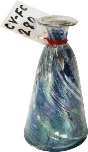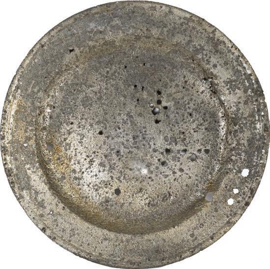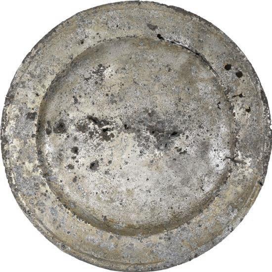 2086. Bottom part of a large glass pitcher etched with floral pagoda scene, ex-Guadalupe and Tolosa (1724). 283 grams. 5” at tallest, 3½” in diameter. Very thin and fragile, the remaining clear glass etched all over with a three-masted ship in the center of one side. FRAGILE - PICK UP IN PERSON ONLY. From Guadalupe and Tolosa (1724), with original certificate from Captain Tracy Bowden through his contract with the Dominican Republic and copy of the article “Graveyard of the Quicksilver Galleons” by Mendel Peterson from the December 1979 issue of National Geographic signed by Bowden. Estimate: $150-$225. 2087. Tin or pewter spoon in conglomerate with iron spike and other debris, ex-Guadalupe and Tolosa (1724). 269 grams total. 9” long. Interesting agglomeration of spoon with debris, most of the spoon pointing out of the matrix, a great piece for display. Unfortunately, XRF testing shows the round disk in the conglomerate is NOT a coin or lead seal. From Guadalupe and Tolosa (1724), with original certificate from Captain Tracy Bowden through his contract with the Dominican Republic and copy of the article “Graveyard of the Quicksilver Galleons” by Mendel Peterson from the December 1979 issue of National Geographic signed by Bowden. Estimate: $100-$150.