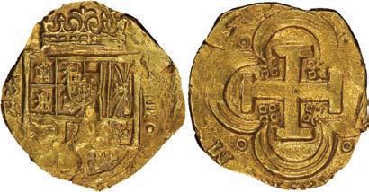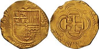 22. SPAIN, Seville, gold cob 4 escudos, Philip IV, assayer not visible, style of assayer R (1640s), NGC MS 63, “top pop.” Cal-Type 396; Fr-203; KM-107.2. 13.43 grams. Compact, roundish flan with nice full shield and bold full cross showing an almost flowerlike feature in center from compass-point damage to die, minimal peripheral detail but satinsmooth surfaces all over dictating its exemplary grade (tied with just one other for finest in NGC census). NGC #6877576-003. Estimate: $6,000-$9,000.