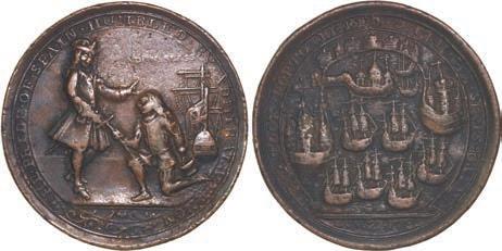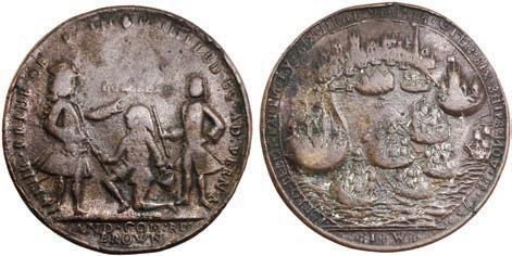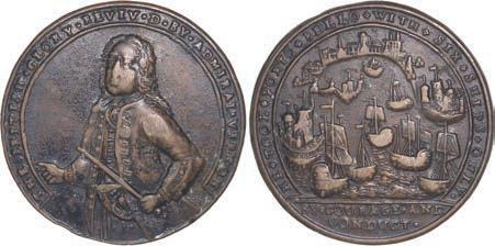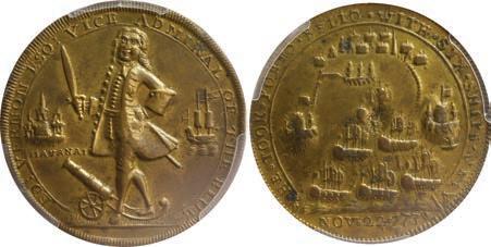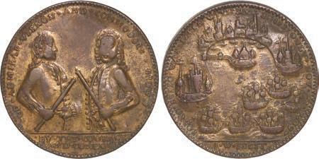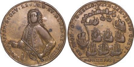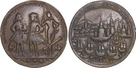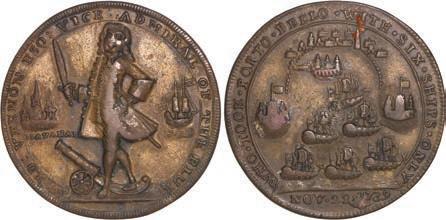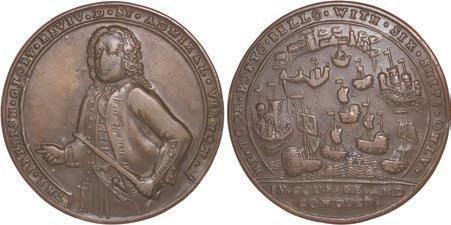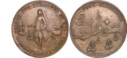 2057. GREAT BRITAIN, copper alloy Admiral Vernon medal, 1741, Cartagena. AC-CAv6G. 11.15 grams. 37 mm. XF with well-detailed design, dark brown-toned surfaces. XRF: 48.73% copper, 47.74% zinc, 2.87% lead. Estimate: $125-$200.