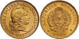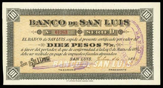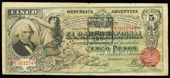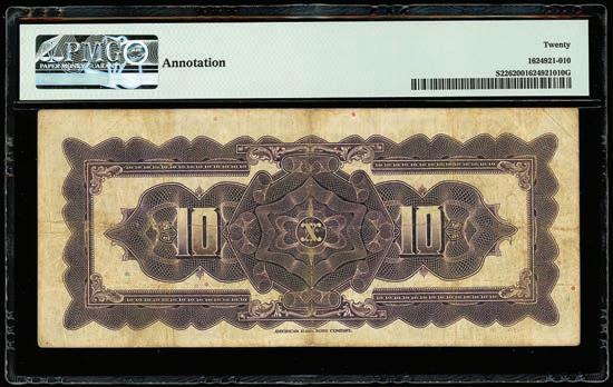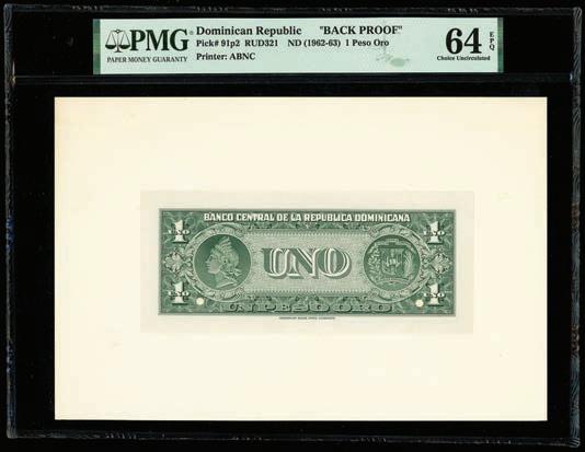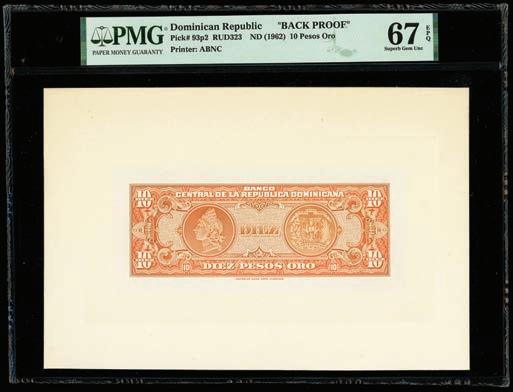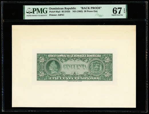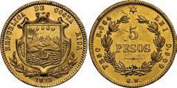 2062. PARAGUAY, Banco de la República, 100 pesos, 2612-1907, series A, serial 0019064. Pick-122. Choice UNC note with nice centering and great ink colors throughout. Estimate: $100-$150. 2063. PARAGUAY, Banco de la República, serial numbermatched pair of a 100 and 5 pesos, 26-12-1907, series A, serial 0012217, with black overprints dated 11-1-1912 and 20-5-1912. Pick-133, 127. Interesting serial number-matched set of these overprinted Paraguayan notes. While we’ve seen a matched set of the 1907 100 and 5 pesos before, this is the first we’ve encountered with the 1912 overprints. Both crisp UNC notes with some paper toning. Estimate: $125-$200.
