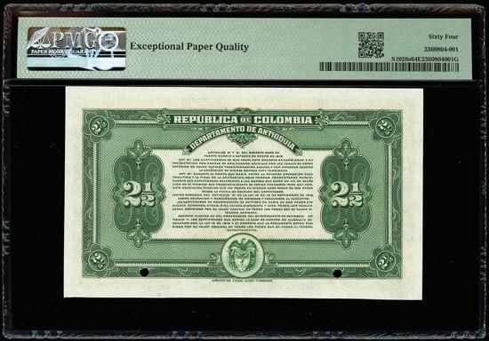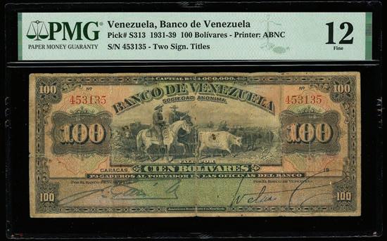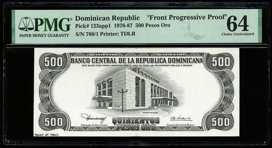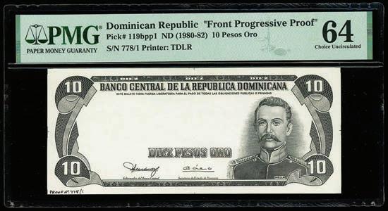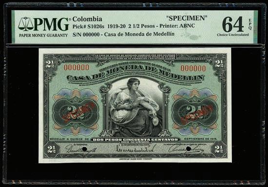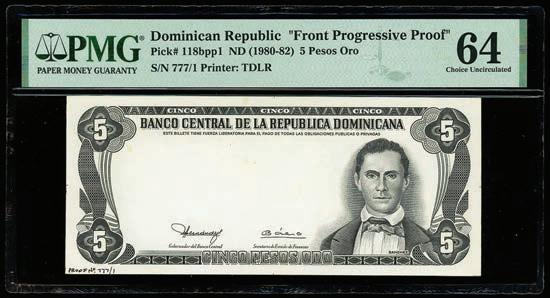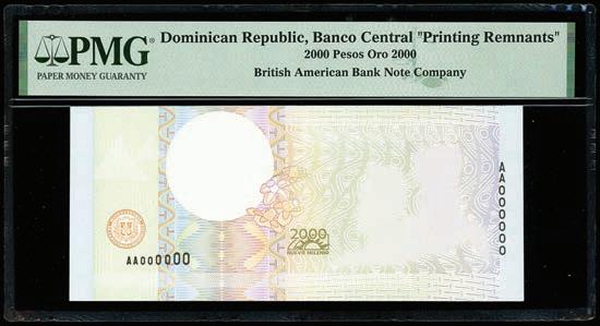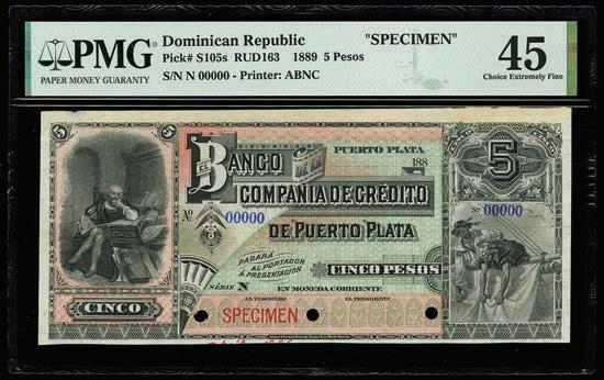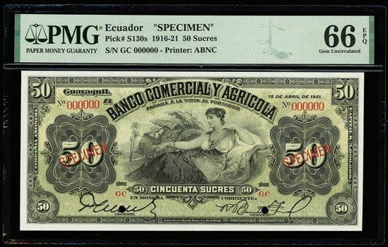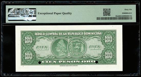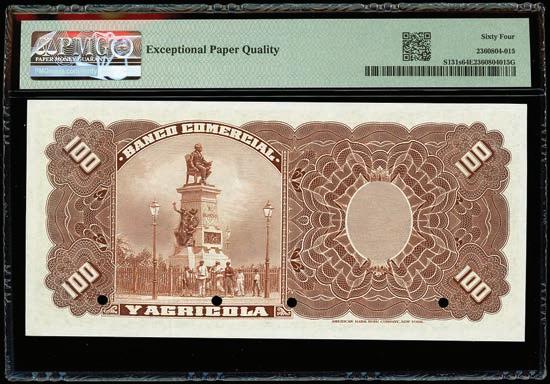 2064. PARAGUAY, Banco de la República, provisional 100 pesos, 26-12-1907, series A, serial 0026433, with black oval overprint dated 11-1-1912, PCGS Banknote Choice UNC 64, “top pop.” Pick-134. Tied with four others for finest known in the PCGS Banknote census. Boldly printed design plus strong signatures and overprint, nice example for the type. PCGS Banknote #45896740. Estimate: $125-$200.