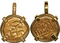 2074. MEXICO, Mexico City, cob 1 real, Charles II, assayer not visible, neat shape, mounted cross-side out in 14K gold pendant with fixed bail. 2.62 grams total. Teardrop-shaped VF+ cob with bold, nearly complete cross, bold upper half of shield along with most of the crown showing, neatly mounted and ready for wearing. Estimate: $200-$300.