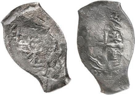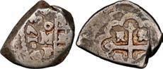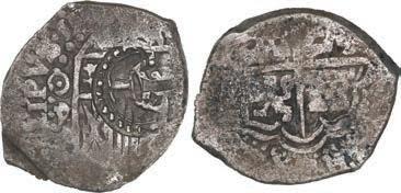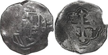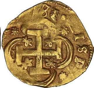 25. SPAIN, Seville, gold cob 2 escudos, 1684 (assayer not visible), extremely rare. Cal-unl (Type 154); Fr-unl (227 for type); KM-unl (211 for type). XF+ with bold full shield and cross, the latter off-center enough to allow clear bottom half of 1684 date (possibly unique) but the shield too well centered to allow a clearly visible mintmark or assayer (probably assayer S, but M and L are also possible), sediment in crevices. Estimate: $2,500-$3,750.