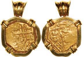 2075. BOLIVIA, Potosí, cob 2 reales, Philip IV, assayer T (mid-1620s), mounted cross-side out in 14K gold pendant with fixed bail. 9.96 grams total. Boldly struck VF piece with nice full cross and tressure, strong partial shield with clear mintmark and assayer, even dark gray-toned surfaces. Estimate: $300-$450.