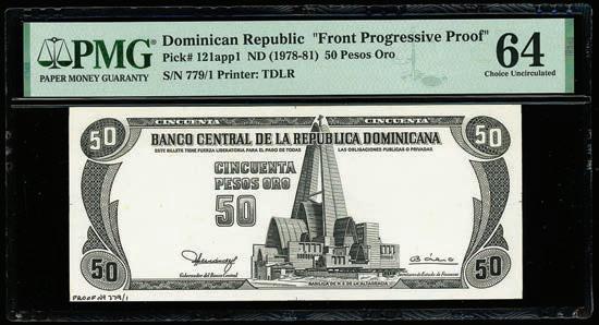 2066. PARAGUAY, Banco Central, 50 guaranies, 25-3-1952 (1963), serial A6466065, additional inverted signatures error, PCGS Banknote Choice UNC 64. Interesting error with an inverted second set of Gerente and Presidente signatures across BANCO CENTRAL DEL PARAGUAY. Choice note with very nice paper quality and ink colors. PCGS Banknote #47217258. Estimate: $125-$200.
