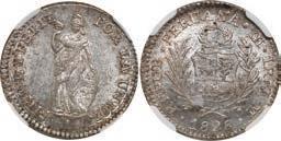 2037. PERU, Lima, ½ real, 1834 MM, NGC MS 64, exHernandez, ex-O’Brien. KM-144.1. Lustrous piece with bright fields lightly toned with golden color, struck a bit off-center yet most details remain quite bold. NGC #6919837-018. Pedigreed to the Carlos Hernandez Z. Collection (stated on label) and to the John O’Brien Collection (stated on label), with his tag. Estimate: $100-$150.