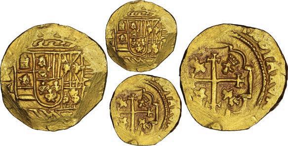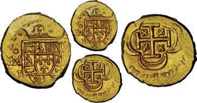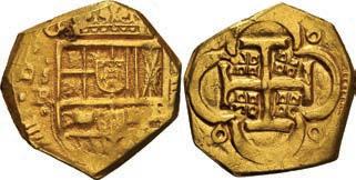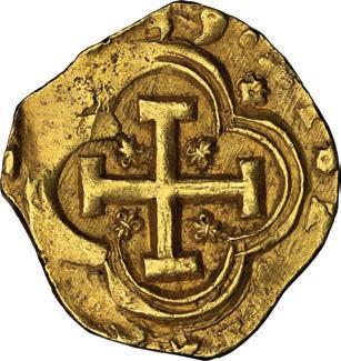17. SPAIN, Seville, gold cob 2 escudos, Philip III or IV, assayer not visible, NGC MS 63, finest known in NGC census. 6.75 grams. Broad, odd-shaped flan with super-sharp high-grade full shield and cross, peripherally crude (and flat) but attractively lustrous, the finest at NGC for this type without visible date. NGC #6908828-004. Estimate: $3,000-$4,500.