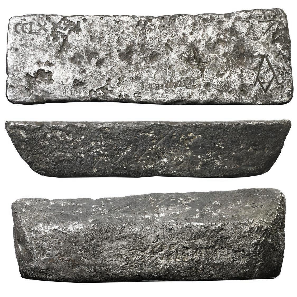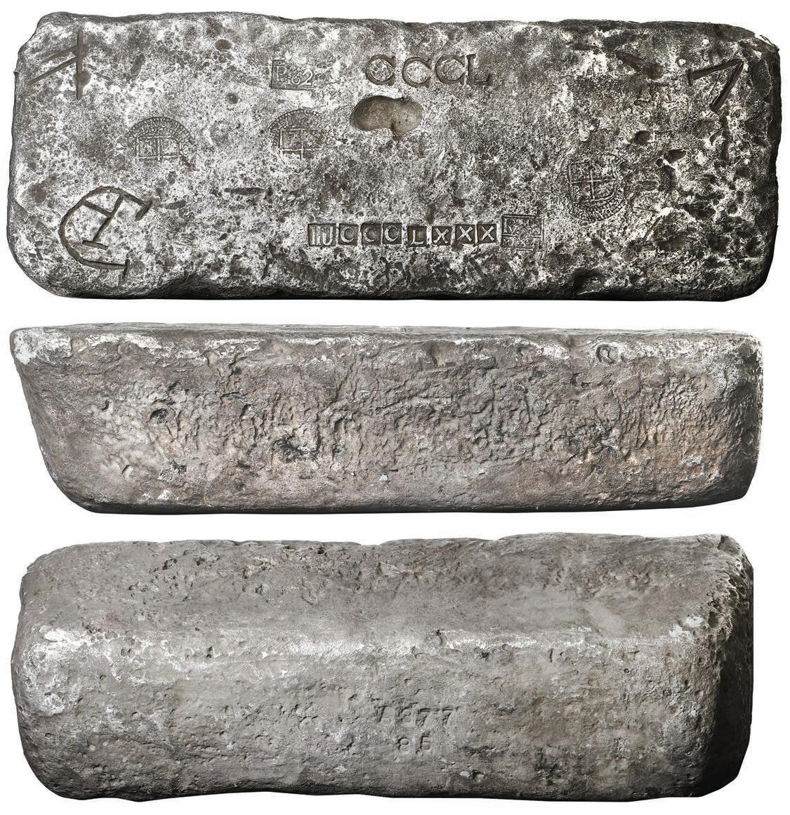 Shipwreck Ingots hosts one of the finest selections of shipwreck gold bars that we’ve had so far, with several unique gold ingots from the “Golden Fleece” wreck, the Atocha, the 1715 Fleet, the Luz, and the “Nanking Cargo” (Lots 73-77). Four large silver bars from the Atocha in this sale make a veritable grade set with Class Factors 0.7 up to the perfect 1.0 available for bidding (Lots 82-85).