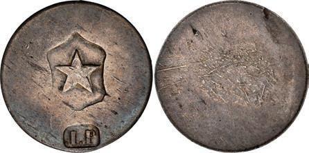 2056. VENEZUELA, Caracas, copper ¼ real, Ferdinand VII, 1817, with Puerto Cabello countermark (1823-26) on date side. KM-C2 (host coin); Stohr-RI.23. 2.89 grams. Bold VF countermark (readily recognizable, often described as nonsensical “Chinese” writing inside a rectangular indent) struck partially over the date of the well-circulated host (Fair). Estimate: $100-$150.