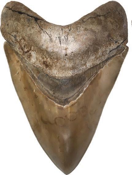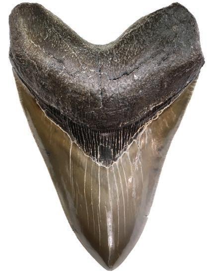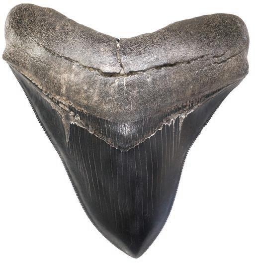 2097. Megalodon (giant shark) tooth, Miocene epoch, approx. 15 to 5 million years old, found off the Atlantic coast of the United States. 151 grams. 3” x 4¼”. From the Carcharocles megalodon (meaning “big tooth,” an extinct species of shark), this tooth is relatively small and extremely well preserved with intact bright gray enamel, serrated edges, and typical dark gray root. Estimate: $250-$375.