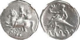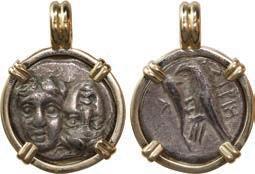 Ancient Roman 2079. ANCIENT ROMAN, Roman Republic, AR denarius, C Fonteius, 114-113 BC, mounted in 14K gold pendant with fixed bail. 4.38 grams total. Mounted with the Janiform head of the Dioscuri out, off-center galley on reverse, both sides somewhat corroded but details fully visible, dainty setting. Estimate: $250-$375. 2080. ANCIENT ROMAN, Roman Republic, AR denarius, L Flaminius Cilo, ca. 109/8 BC, mounted in 14K gold pendant with fixed bail. 5.02 grams total. Mounted with Roma side out, biga on reverse, deeply toned with XF details in a dainty setting. Estimate: $200-$300.