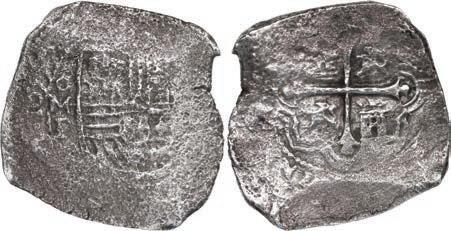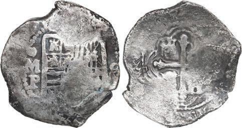 2069. MEXICO, Mexico City, cob 8 reales, 1639 P, exConcepción (1641), mounted shield-side out in large sterling silver cuff bracelet. 232 grams total. Broad flan with clear mintmark and assayer to left of bold and nearly complete shield plus final digit of date, visible reverse side with full cross, securely mounted in a custom-made bracelet with maker’s mark “UB / .925 OM / MIAMI / ‘95’” on the inside. From the Concepción (1641), with original certificate from Captain Tracy Bowden through his contract with the Dominican Republic. Estimate: $350-$500.