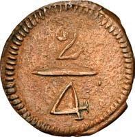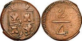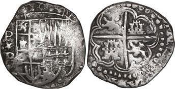 2046. SPAIN, Segovia, milled 4 reales, Philip III, 1614/0 AR/C, NGC AU details / cleaned, finest and only example in NGC census. Cal-788; KM-unl (62 for type). Clear 1614/0 overdate and also clear over-assayer AR/C (erroneously labeled by NGC as AR/G, but the only one listed for this date in any form), which is unlisted in KM, and in Calicó appears with a high catalog value, this example well centered and boldly struck, with high points a little bright from past cleaning though toned with colorful hues in the legends. NGC #6700350-007. Estimate: $400-$600. 2047. SPAIN, Toledo, copper 8 maravedís, Philip III, 1618, special issue struck for trade with Oran (Algeria). Cal-350; KM-L3. 18.75 grams. Scarce type struck in Toledo for use in Oran during Spanish occupation. Darkly toned, with bold full shield and clear mintmark, other side rather weak with date barely visible in legend above the O of ORAN. Estimate: $100-$150.