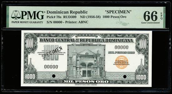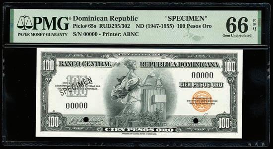 2067. PARAGUAY, Banco Central, 1 guaraní, 25-3-1952, serial A29305023, inverted signatures error, PCGS Banknote Gem UNC 66 PPQ, “top pop.” Similar to the prior lot but with only a single set of Gerente and Presidente signatures, these mistakenly printed upside down and across BANCO CENTRAL DEL PARAGUAY. A nice, Gem note with great centering and coloration, tied with just one other for finest known in the PCGS Banknote census. PCGS Banknote #47217255. Estimate: $125-$200.