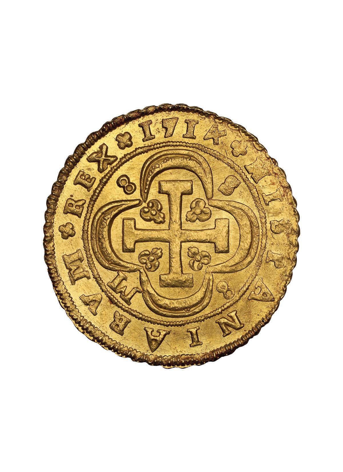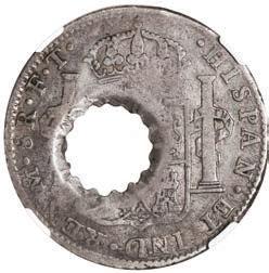 2071. MEXICO, Mexico City, cob 8 reales, (1714) J, new style obverse, old style reverse, ex-1715 Fleet, mounted in silver bezel with simple ring loop. 29.05 grams total. Corroded and cleaned yet with much of the shield showing along with bold full mintmark, assayer, and denomination plus part of the king’s name, partial cross along with -RVM (“RUM”) twice in legend. From the 1715 Fleet, with photo-certificate. Estimate: $250-$375.