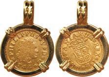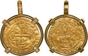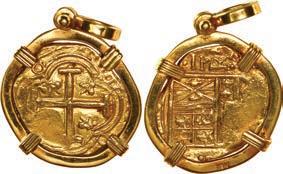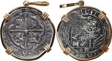 2070. MEXICO, Mexico City, cob 8 reales, Charles II or Philip V, assayer not visible, ex-1715 Fleet, mounted in 14K gold pendant with fixed bail. 24.27 grams total. With dark, corroded surfaces but still retaining its irregular shape, securely soldered into its mount. From the 1715 Fleet, with Sedwick photo-certificate. SOLD FOR THE BENEFIT OF THE 1715 FLEET SOCIETY. Estimate: $200-$300.