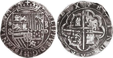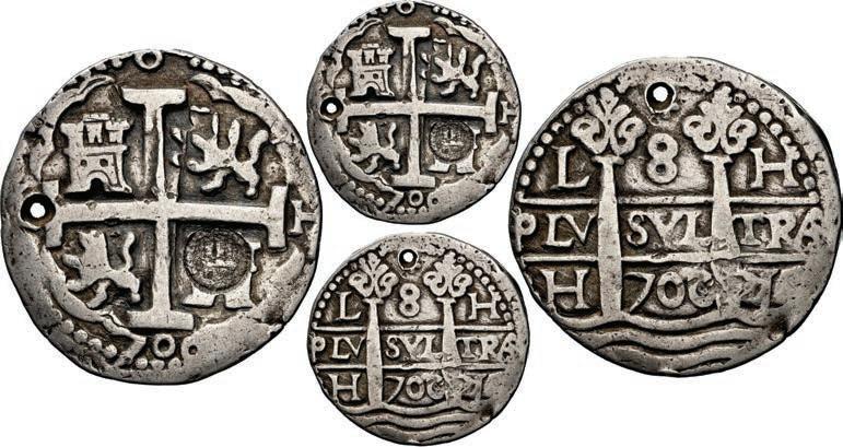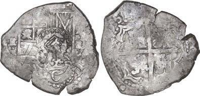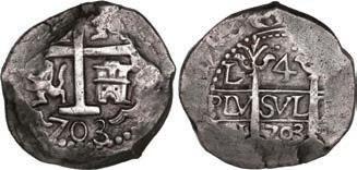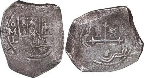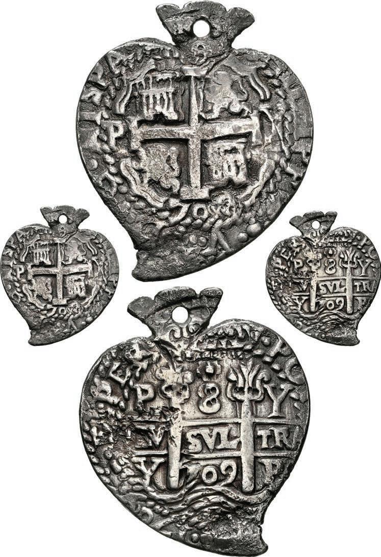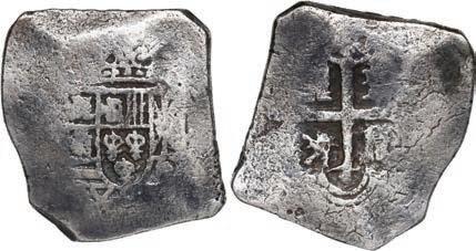 Our robust Potosí Silver Cobs section features more key coins from the Luis R. Ponte Collection including a Philip II cob 8 reales of assayer L (1st period) with denomination o-VIII over P-M to right, a rarity also plated in Grunthal-Sellschopp (Lot 518). A number of very rare Royals from the Potosí Mint are being offered: Watch for the finest known 1704/3 Y cob 8 reales Royal graded NGC AU 55 (Lot 654) and the extremely rare 1709 Y cob 8 reales Heart ex-von Schuckmann (Lot 655) in this section.