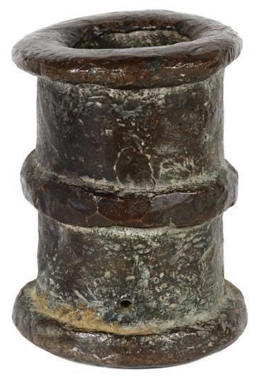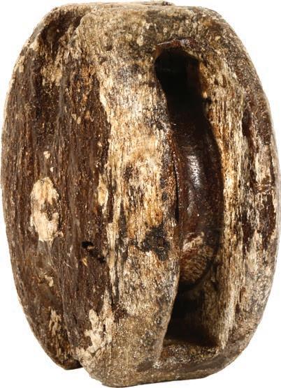 2084. Neck of an earthenware olive jar inscribed with museum number, ex-Concepción (1641). 254 grams. 3¾” diameter, 1½” tall. Coral-encrusted, intact earthenware olive jar neck, inked with number 4P.FC-1171 by the Dominican Republic’s national museum, indicating that it was inventoried before division with Captain Bowden (rare thus). From the Concepción (1641), with original certificate from Captain Tracy Bowden through his contract with the Dominican Republic, and accompanied by the July 1996 issue of National Geographic signed by Captain Tracy Bowden on his article “Gleaning Treasure from the Silver Bank.” Estimate: $100-$150.